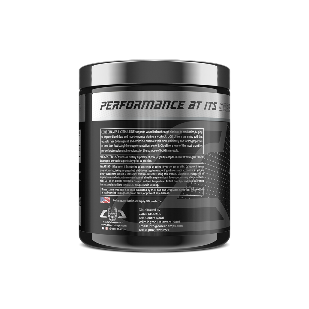 Boost your performance with Core Champs L-Citrulline 2000mg, a premium amino acid supplement that enhances vasodilation and blood flow through increased nitric oxide production. Each serving helps improve muscle pumps, endurance, and recovery, making it ideal for athletes and fitness enthusiasts aiming for next-level training results.